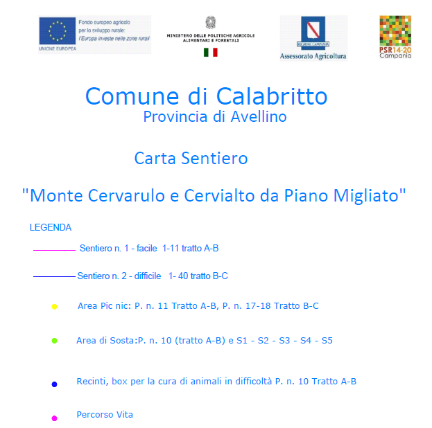 Sentiero n. 2: costituito da un primo tratto che attraversa la faggeta, mentre il secondo attraversa una zona priva di vegetazione o con presenza di faggi isolati o allo stato arbustivo e porta alla vetta dei Monti Cervarulo e Cervialto.